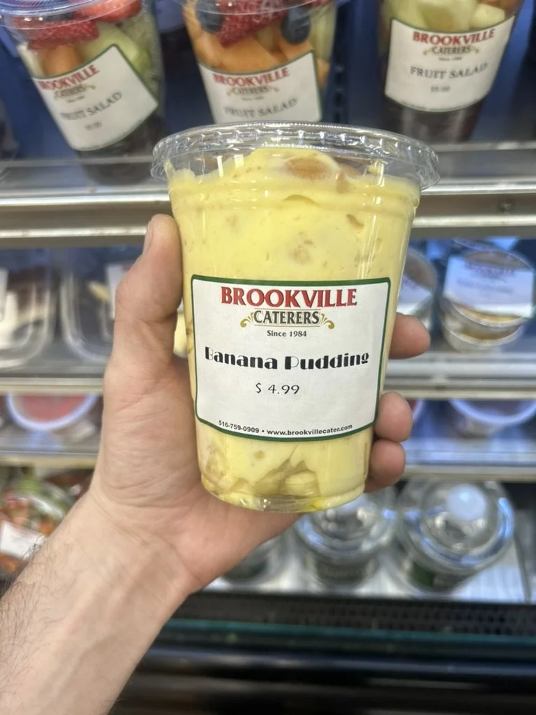 A clear plastic cup of banana pudding with a lid, held by a person in front of a refrigerated shelf with containers of fruit salad, labeled 'Brookville Caterers,' in a grocery store.