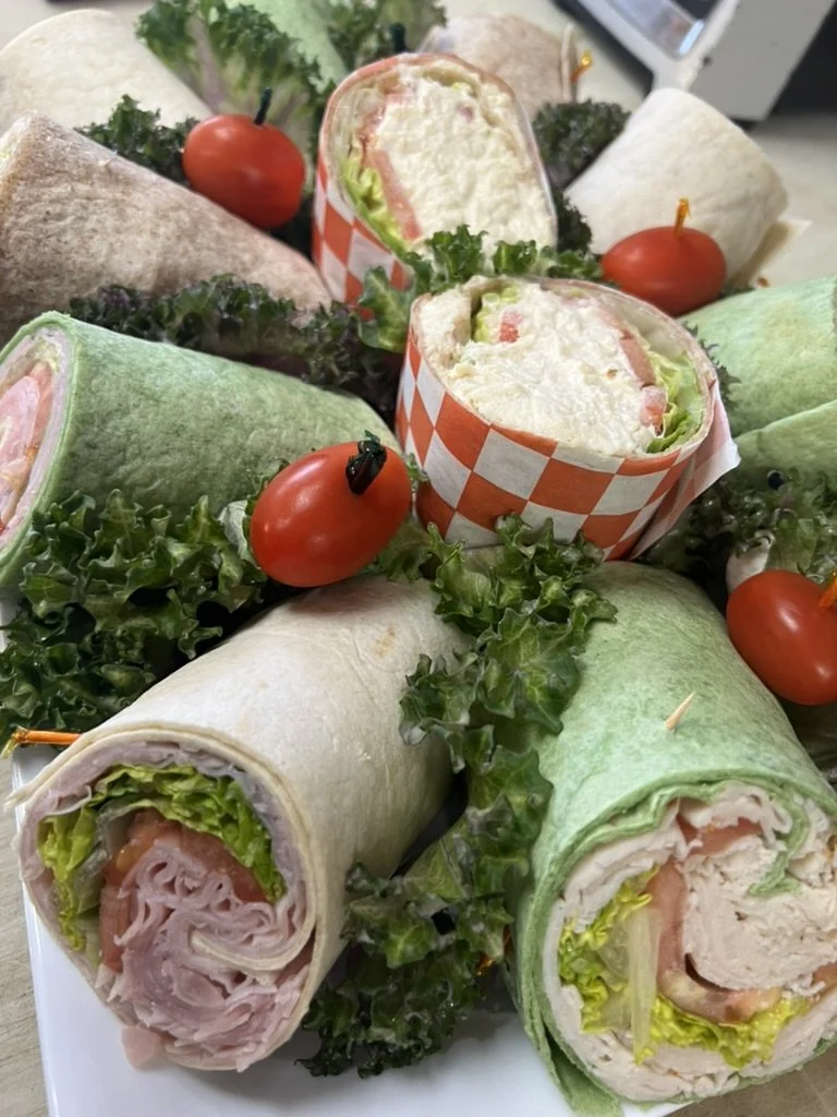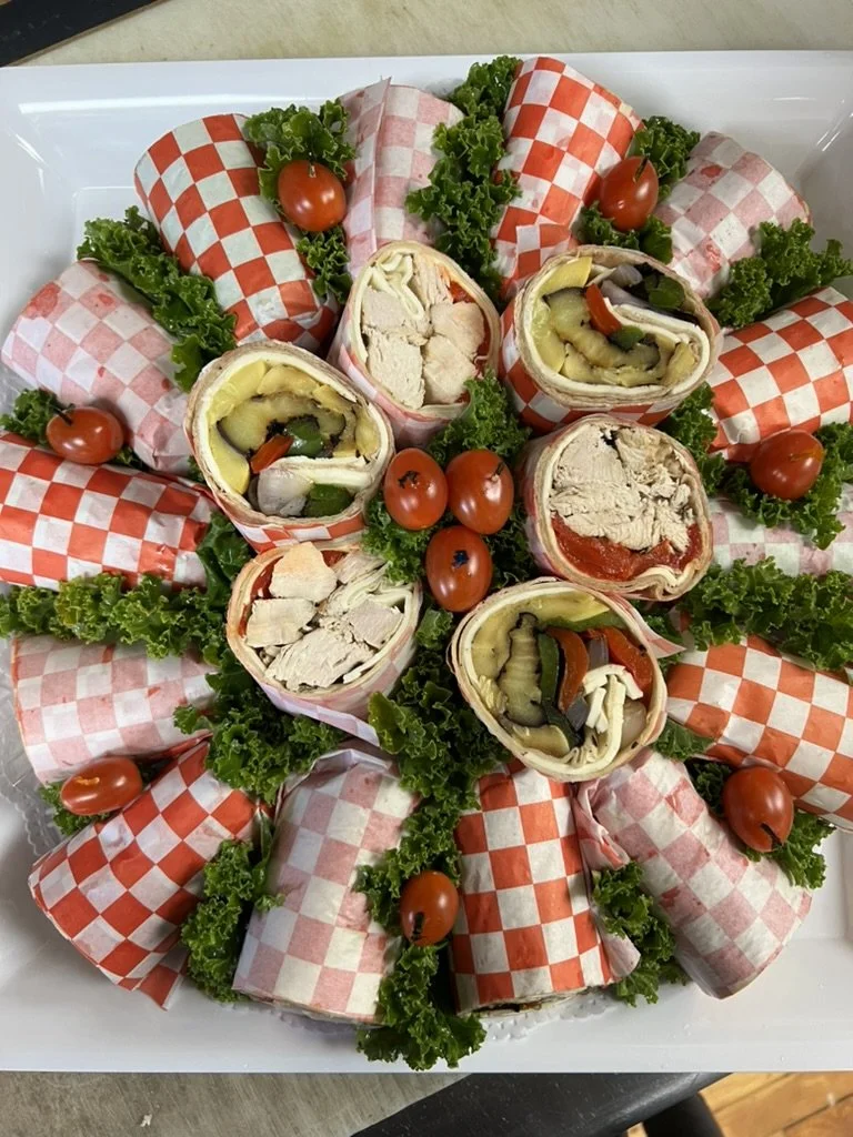 A platter of assorted wraps sliced in half, garnished with cherry tomatoes and curly lettuce, arranged with checkered paper cups, and lettuce leaves.