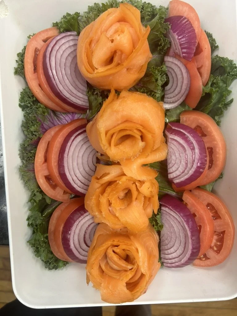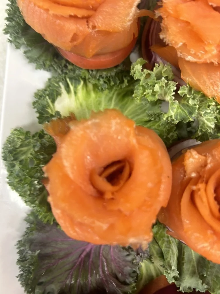 Salmon roses garnished with fresh green kale and purple lettuce on a white plate.