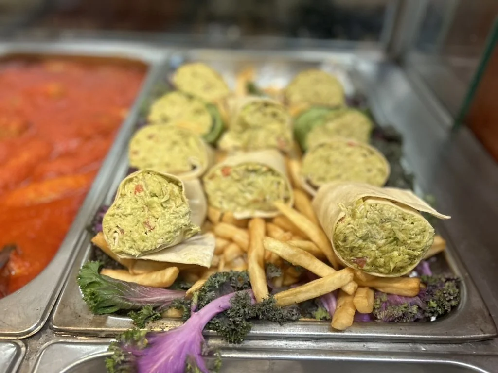 Bakery display with multiple burritos filled with green ingredients, placed on a bed of French fries, garnished with kale.