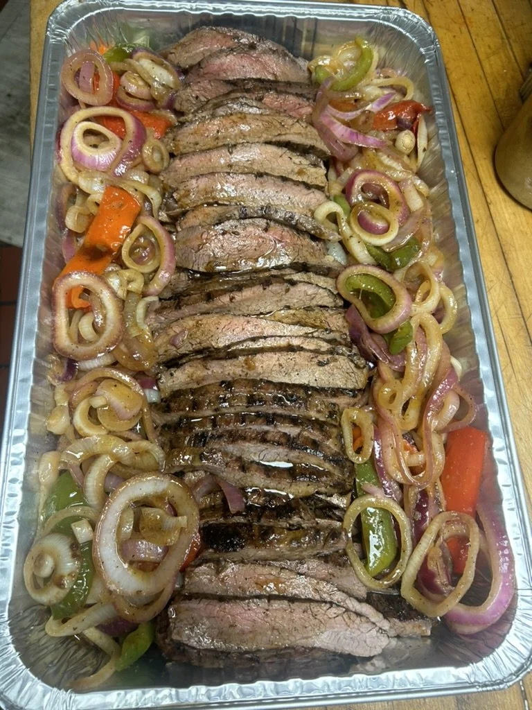 Sliced cooked beef steak topped with grilled vegetables including onions, green peppers, and red peppers, served in a foil tray.