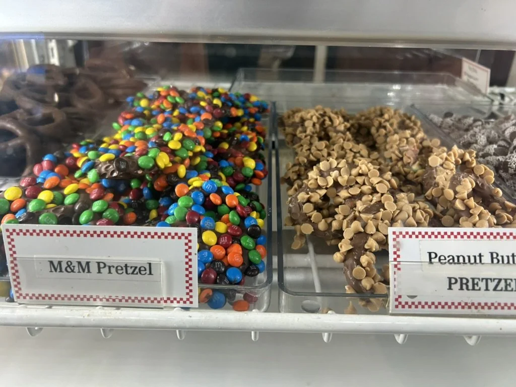 Colorful M&M pretzels and peanut butter pretzels with chocolate and toppings displayed in a candy store.