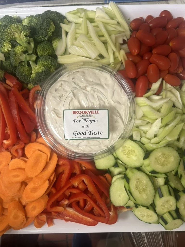 Plate with broccoli, celery, grape tomatoes, cucumber slices, red and orange bell peppers, and a container of creamy dip labeled 'Brookville Caterers, For People with Good Taste'