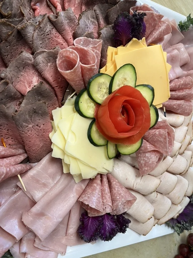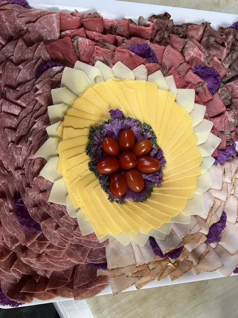 Assorted cold cuts arranged in a decorative pattern with cheese slices, grape tomatoes, and purple garnishes in the center.