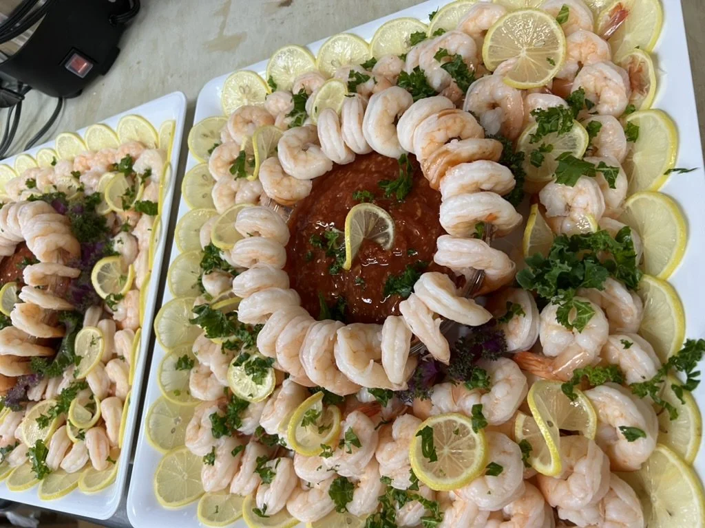 A seafood platter featuring shrimp arranged in a circle around a glazed meatloaf topped with lemon slices, parsley, and decorative greens, all on a white tray.