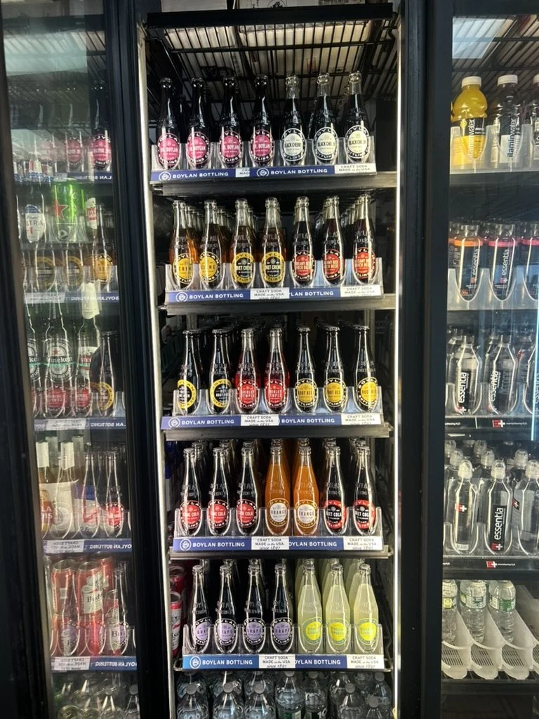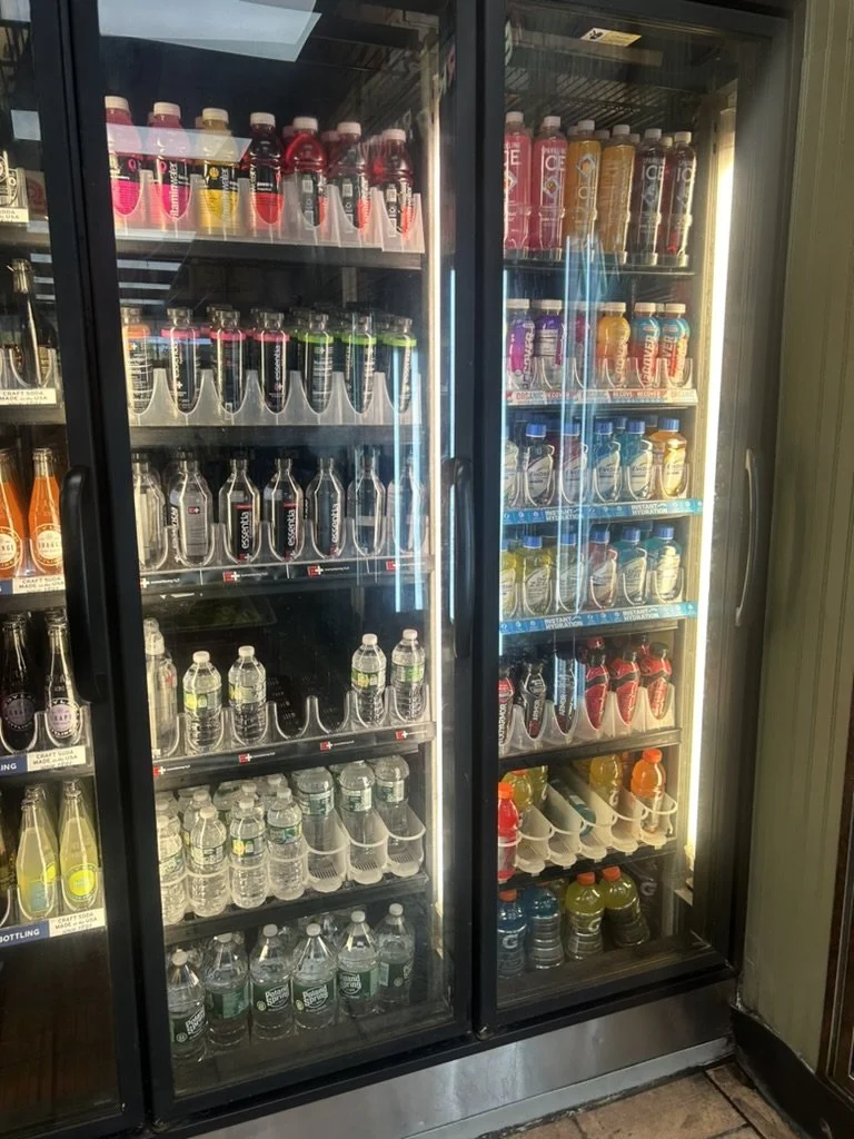 Refrigerator with multiple shelves filled with various bottled energy drinks and bottled water.