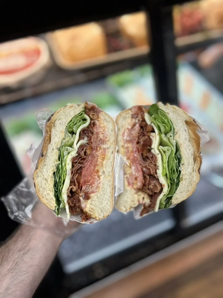 Half of a bacon cheeseburger sandwich with lettuce, tomato, cheese, and beef patty, held in hand in front of a fast food display case.