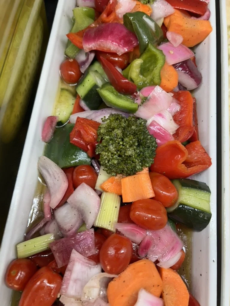Assorted chopped vegetables including cherry tomatoes, red and green bell peppers, carrots, onions, celery, radishes, and a piece of broccoli.